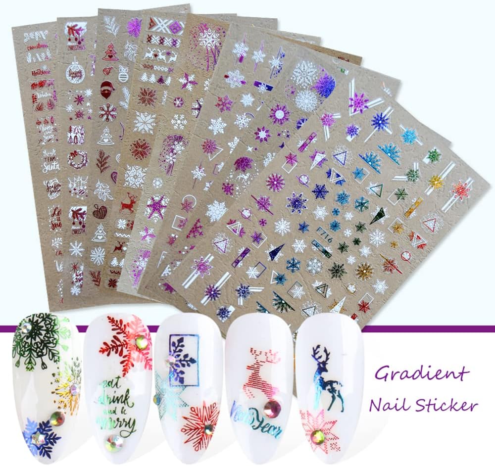 8Sheets Holographic Christmas Nail Decals, Xmas nail stickers are great for your fingernails and toenails decorationsYou can get all Christmas patterns – Christmas elk, Christmas snowflakes, bell, Christmas trees and other Christmas elementsWinter nail stickers bring you best wish.3d winter nail stickers are self-adhesive, No glue needed